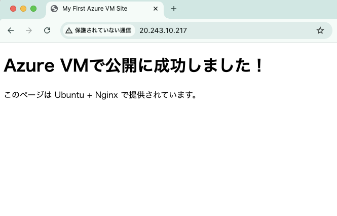 sudo ufw statusAzure ポータルで VM の「パブリック IP アドレス」を確認し、ブラウザからアクセスします。