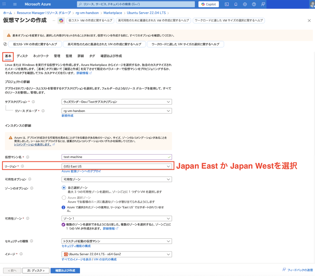 なお、作業中にリージョンを誤って「East US」を選択しVMを作成しようとしたら