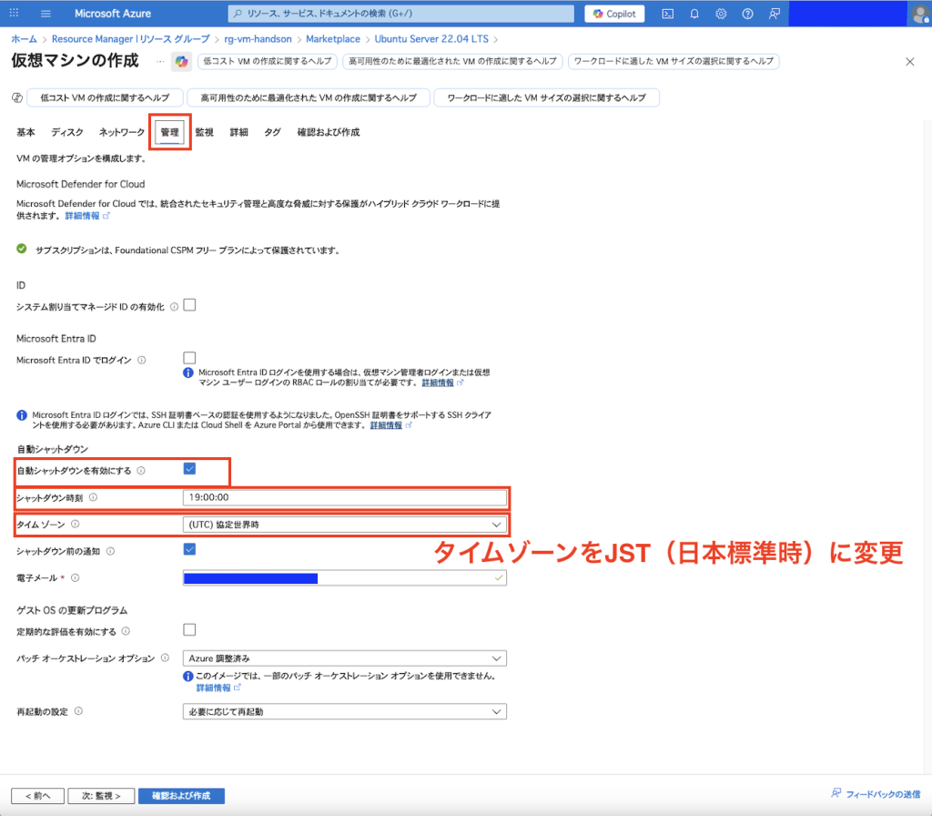 | リソースグループ | rg-vm-handson(手順4で作成したリソースグループ名) |